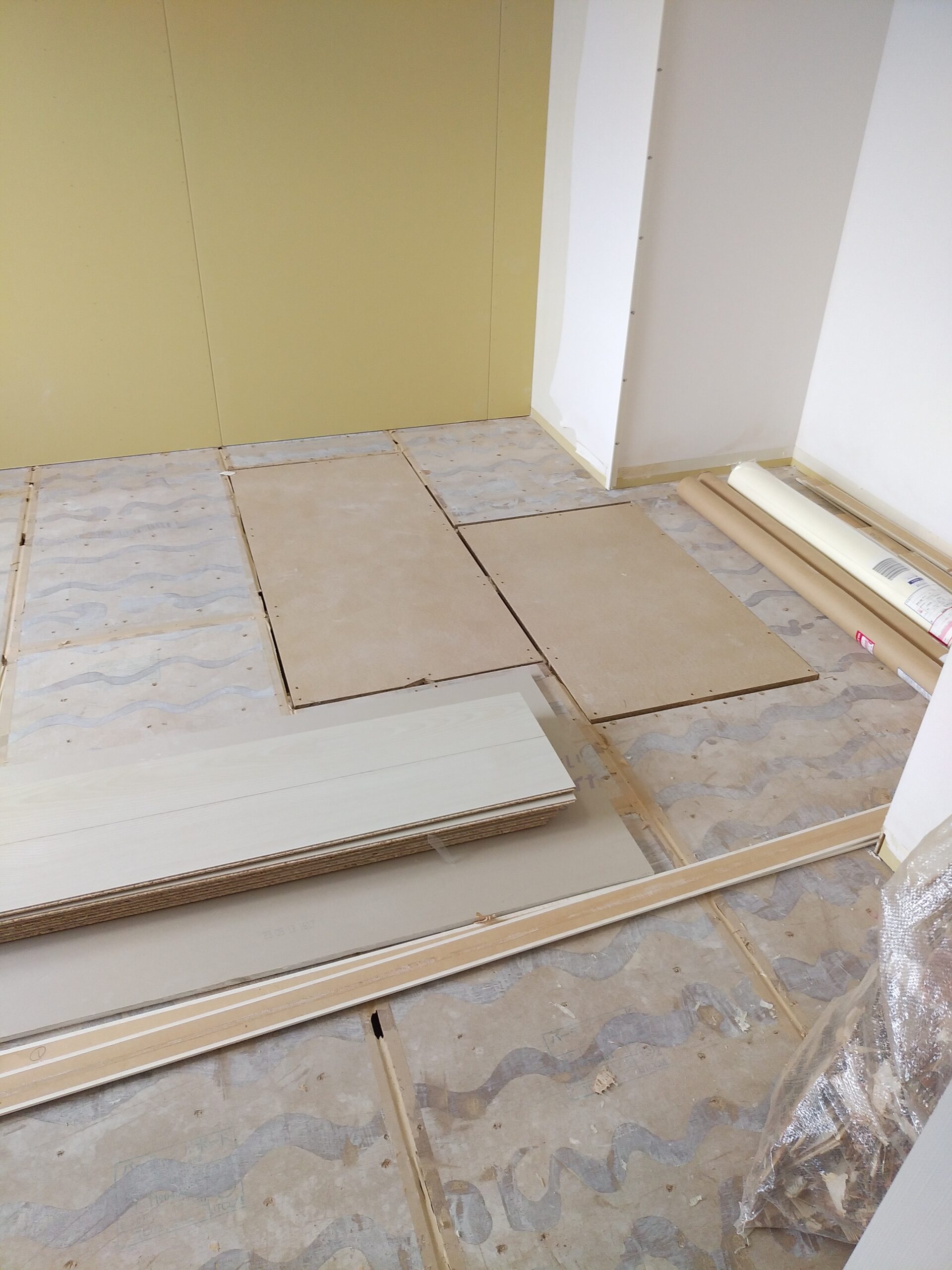 フローリング貼替え工事 既存フローリング剥がし、置き床一部交換中